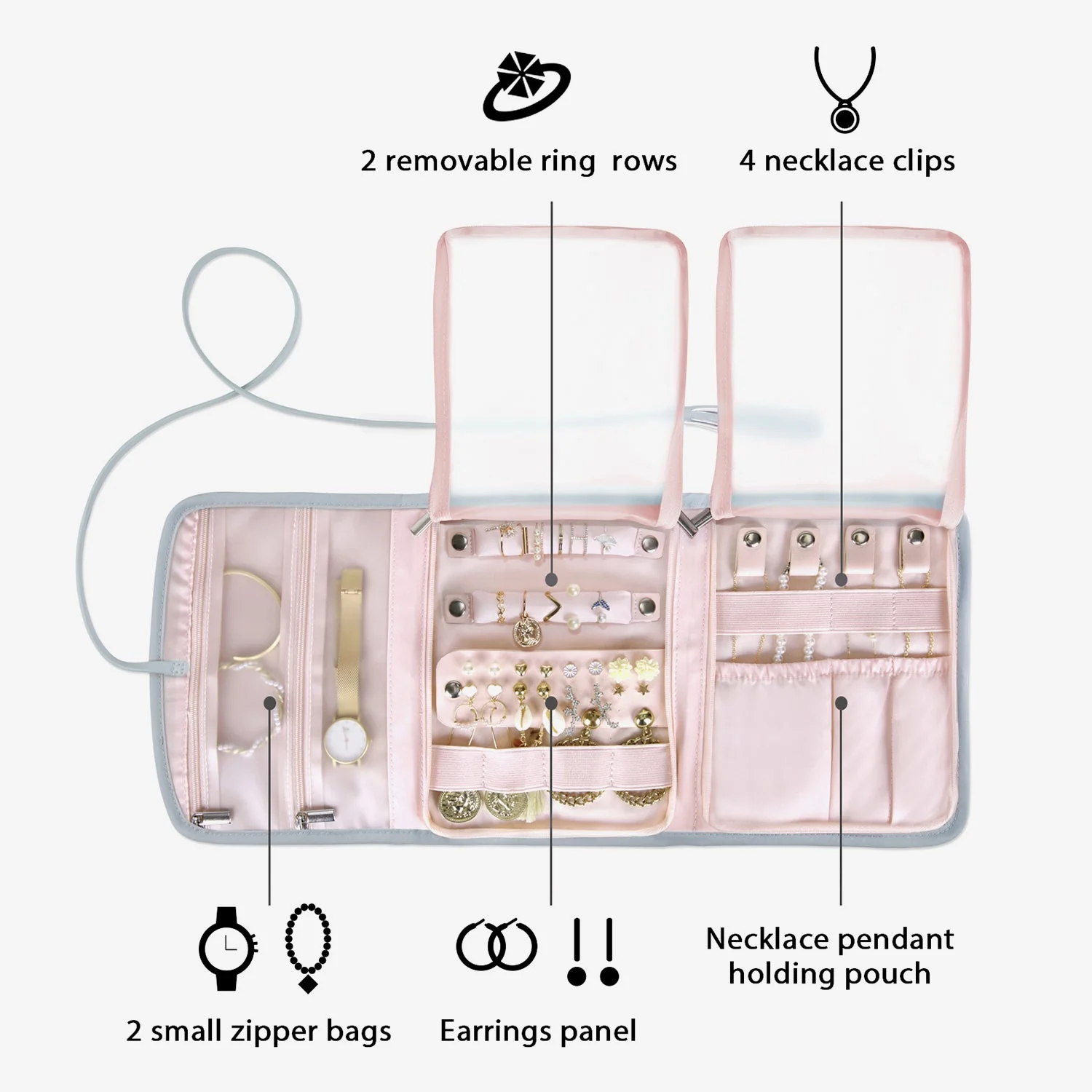 The Isabella Jewelry Organizer epitomizes Bagsmart's vision of style and functionality. Features smart and tangle-free design, such as removable double-ended ring rows for quick access to any ring and attached elastics to prevent necklaces and long earrings from being entangled. Equipped with transparent windows, this small jewelry organizer helps organize the items easily.