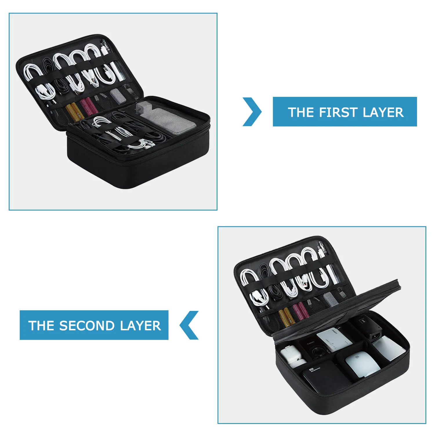 The Large Double Layer Cable Bag represents Bagsmart's savoir-faire. The electronic cord holder is equipped with three different compartments, which allow you to organize various electronic accessories ranging from cords, cables, digital chargers, phones, hard drives, and others. Features extraordinary detailed designs such as elastic straps to keep items in good protection.